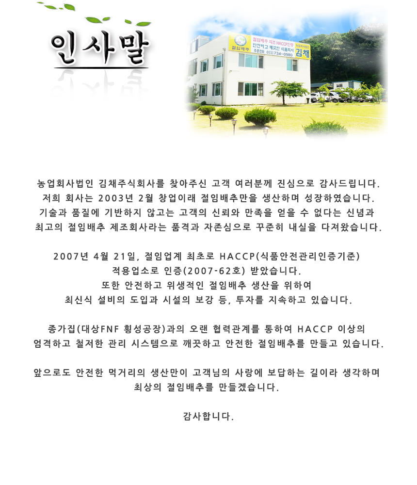 회사명 : 농업회사법인 김채(주) | 사업자등록번호 : 224-81-27720 [사업자정보확인] | 주소 : 강원도 원주시 문막읍 동화큰골길 8-1